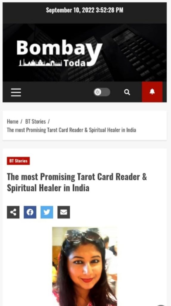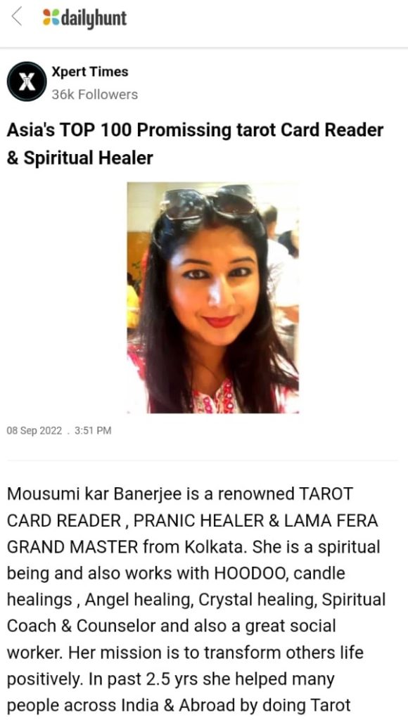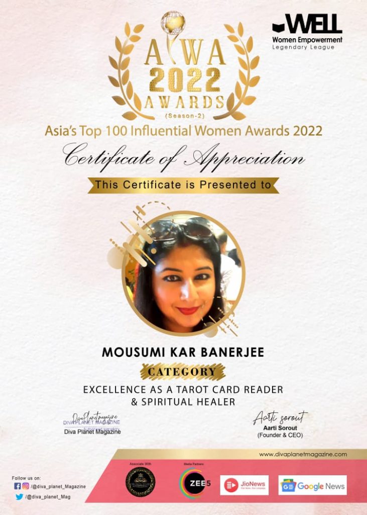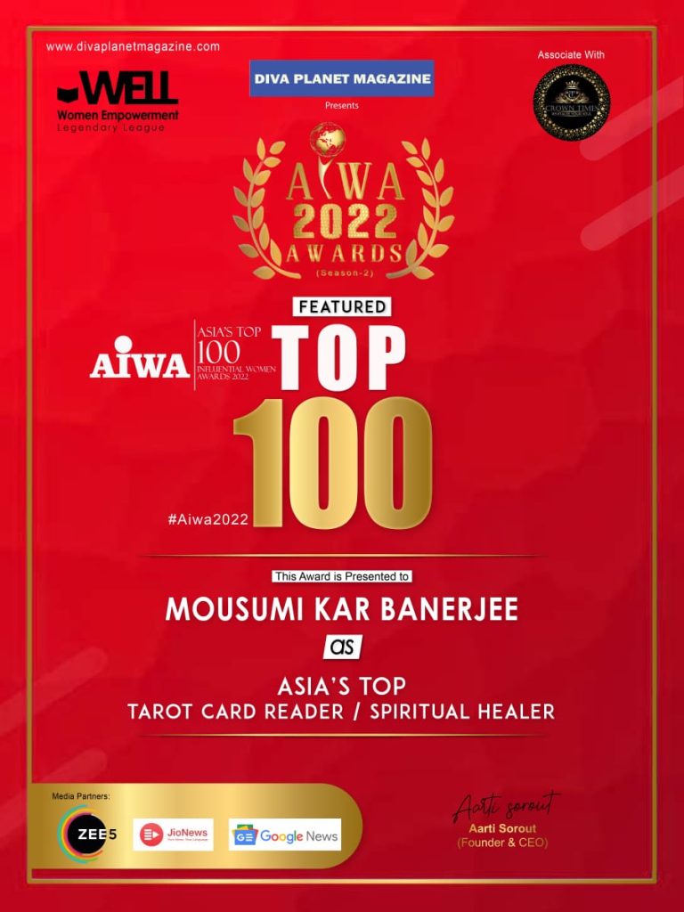 Asia’s top 100 women Influential award 2022 as best Tarot Card reader & spiritual healer.